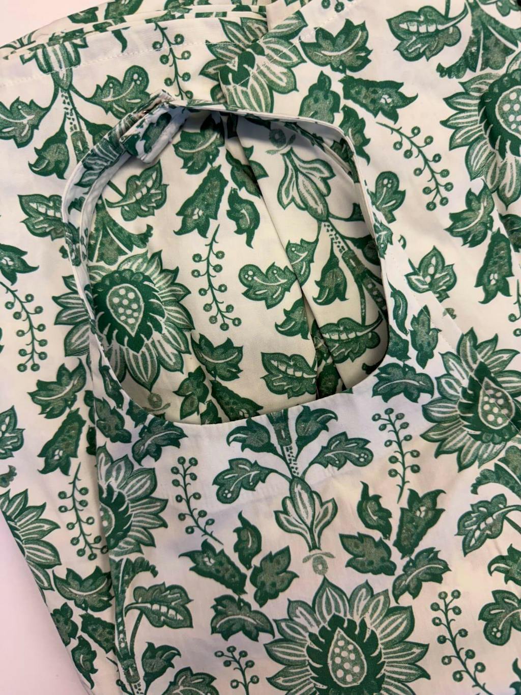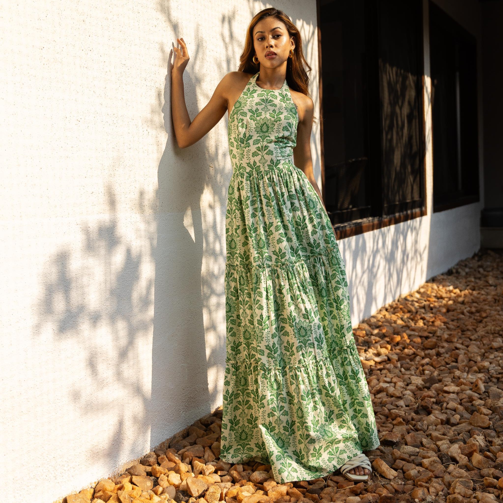 Embody effortless summer chic in our stunning 100% organic cotton poplin Kelly dress. Featuring a beautiful halter neck design, this elegant long dress boasts a vibrant summer green and white print. With the perfect sleek fit, this flowy, tiered dress is perfect for all warm weather occasions, from garden parties to seaside escapades.