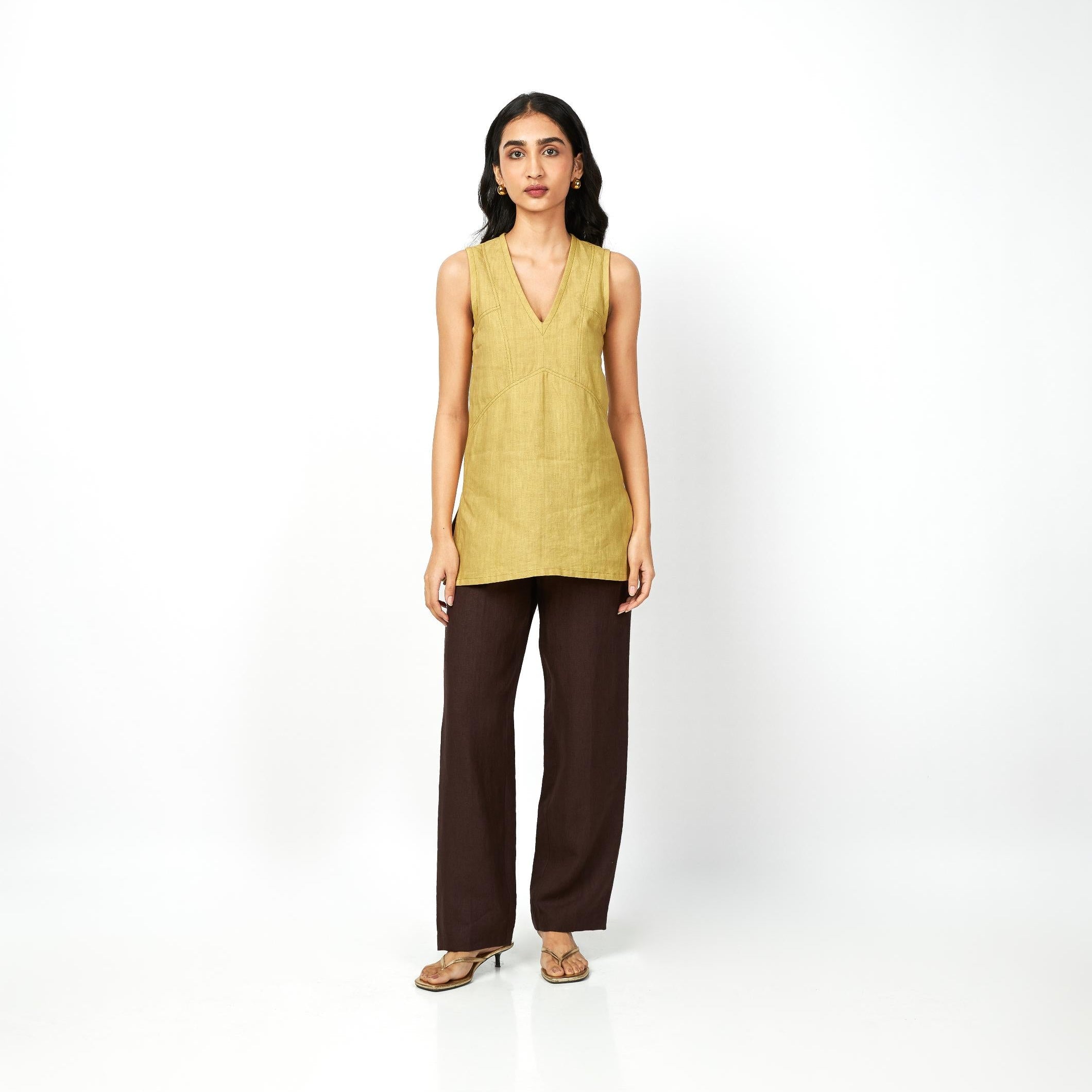 A refined take on summer tailoring, the yellow linen top features a gentle A-line silhouette with side slits for movement, finished with tonal ochre thread detailing for subtle depth and added detail. The top is paired with dark brown linen trousers with back elastic for added comfort and fit. Designed for versatility, each piece can be styled separately, making it a modern, effortless wardrobe staple.