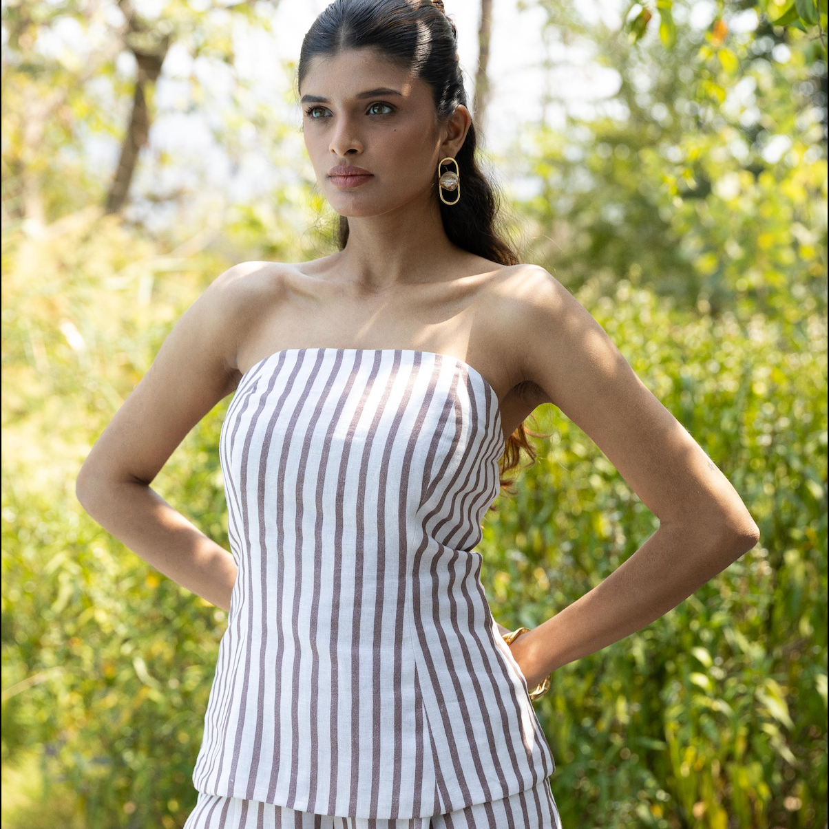 Experience the perfect blend of effortless elegance and versatility with our linen co-ord set. The linen tube top and wide leg pants features classic stripes in mocha mousse. This stylish set is the perfect effortless set that can be transitioned from a dressed up formal fit to a casual, summer look making it perfect for any warm weather event.