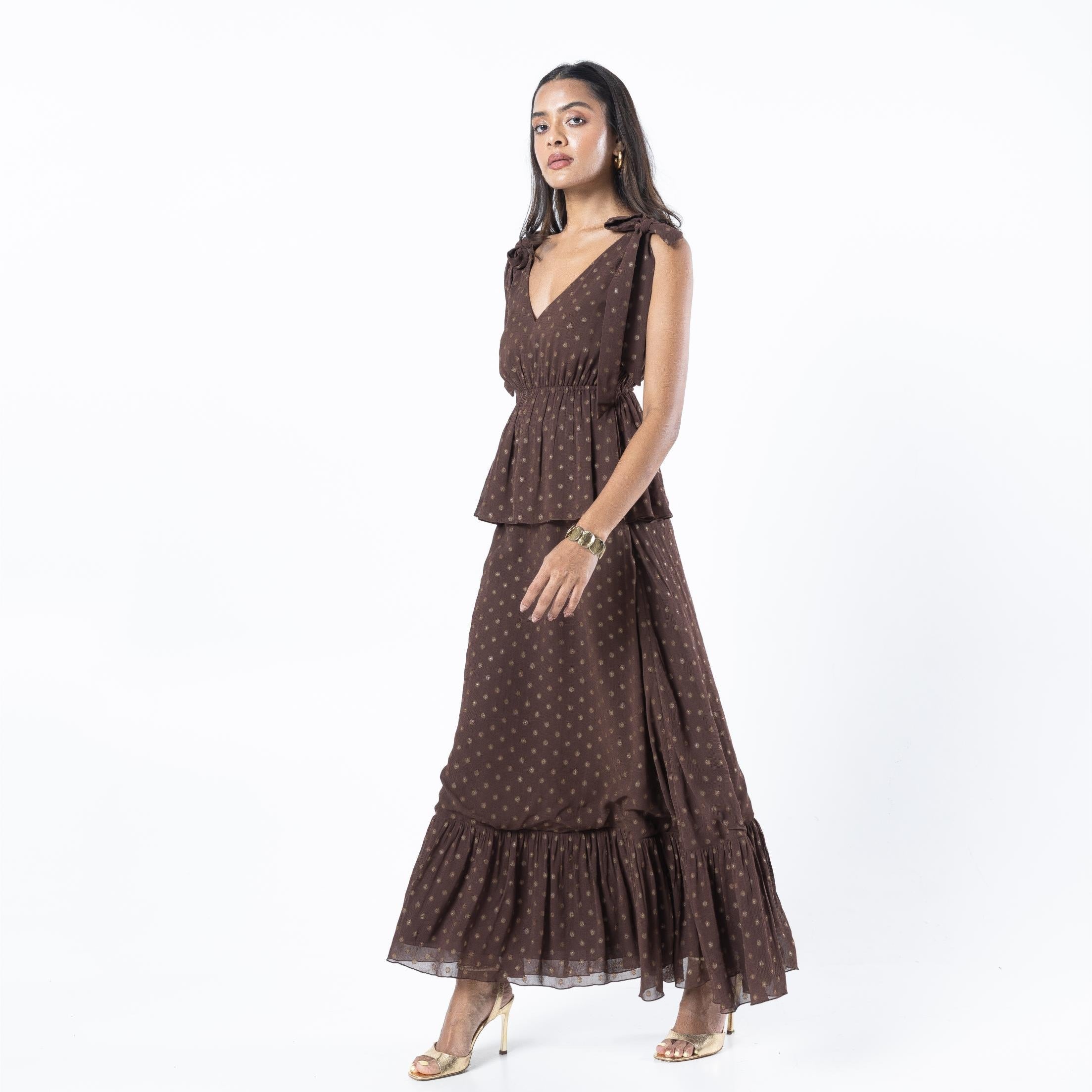 This gorgeous brown set is a perfect blend of elegance and charm. The sleeveless peplum top features stylish tie-up shoulder details, while the skirt with a layered hem is perfect to pair up with the top. The delicate gold self design on the entire set adds a great touch of elegance to the pieces. Ideal for special occasions or to mix it up, this set is a stunning addition to your wardrobe.