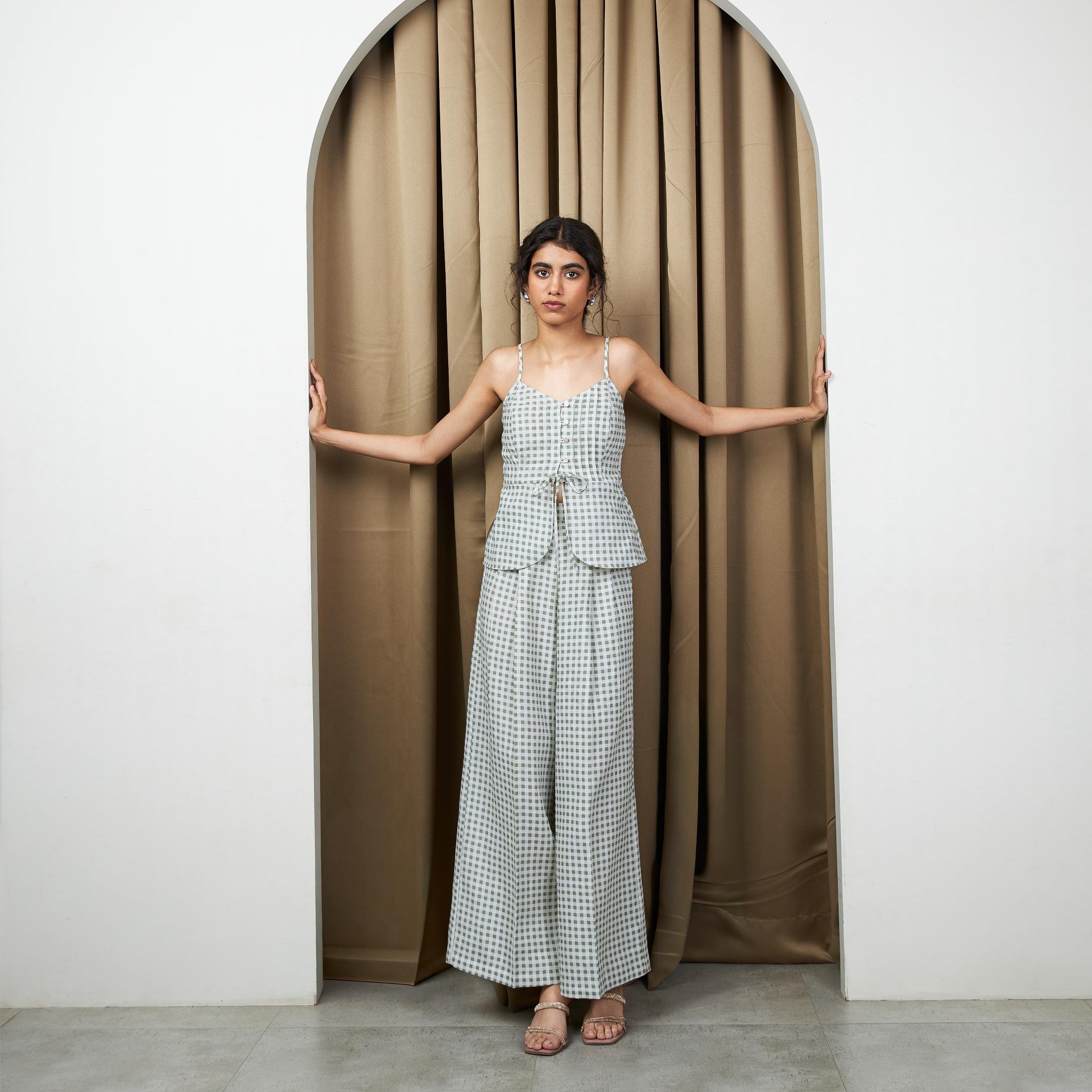 Cut from breathable linen in soft sage and white gingham, this co-ord balances structure with ease. The short peplum top features delicate adjustable straps, front functional buttons, subtle pleat detailing, and a waist tie up for a defined fit. Paired with wide leg trousers, it’s a refined yet playful set designed for versatile summer styling.