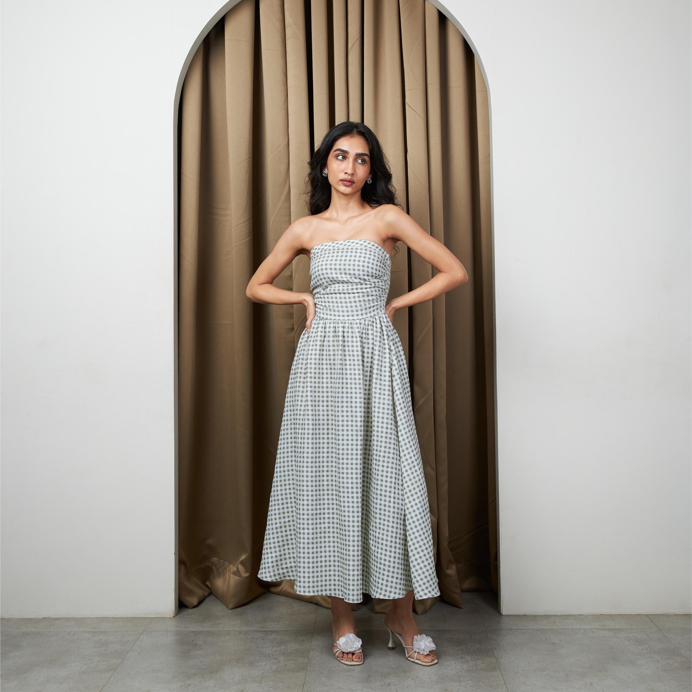 A fresh take on classic summer gingham. Crafted in breathable linen, this strapless silhouette with soft sage green and white checks is softly fitted through the bodice with subtle gathering for shape, before falling into a fluid, full-length skirt. Finished with a smocked back for a flexible fit, it’s light, effortless, and designed for warm days and easy evenings.